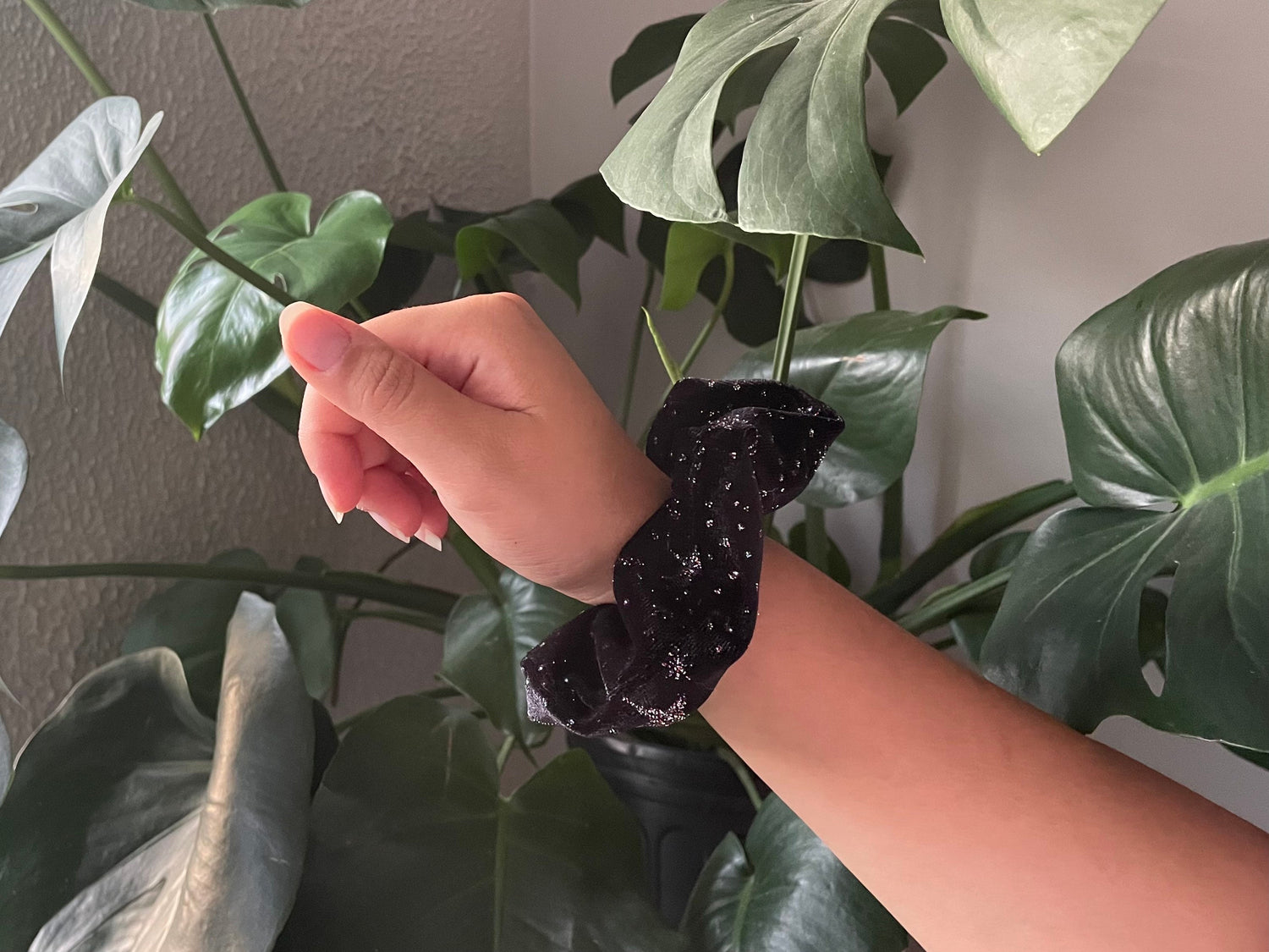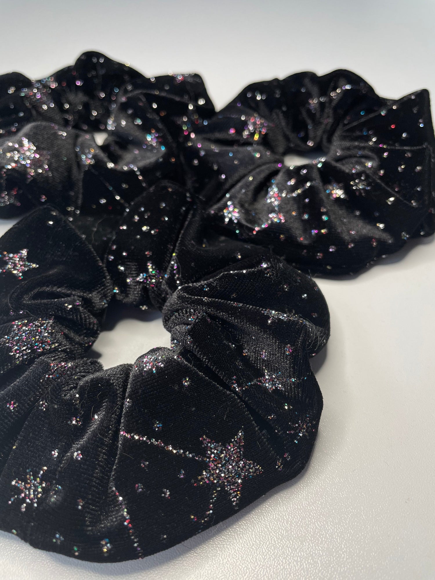 All of our scrunchies are delicately handmade. We carefully choose all of our fabrics with our customers in mind. This scrunchie was made using a beautiful black velvet fabric with a glitterly celestial pattern.