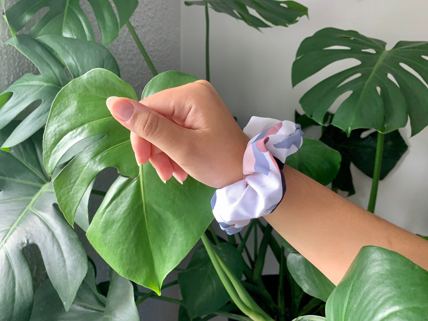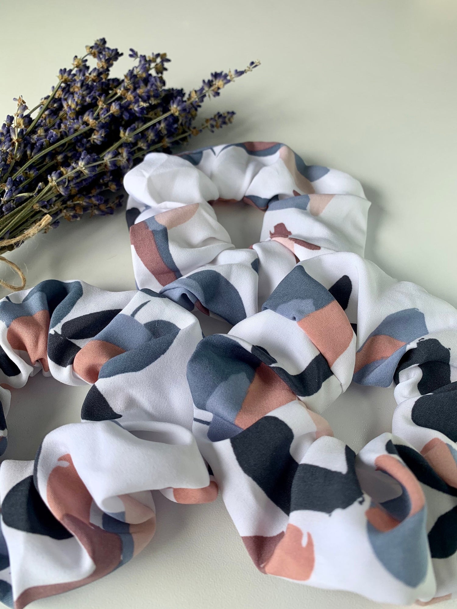 All of our scrunchies are delicately handmade. We carefully choose all of our fabrics with our customers in mind. This scrunchie was made using a beautiful patterend scrunchie with colors: navy, light blue, and pink on a white base. This fabric is incredibly soft and great for your hair.