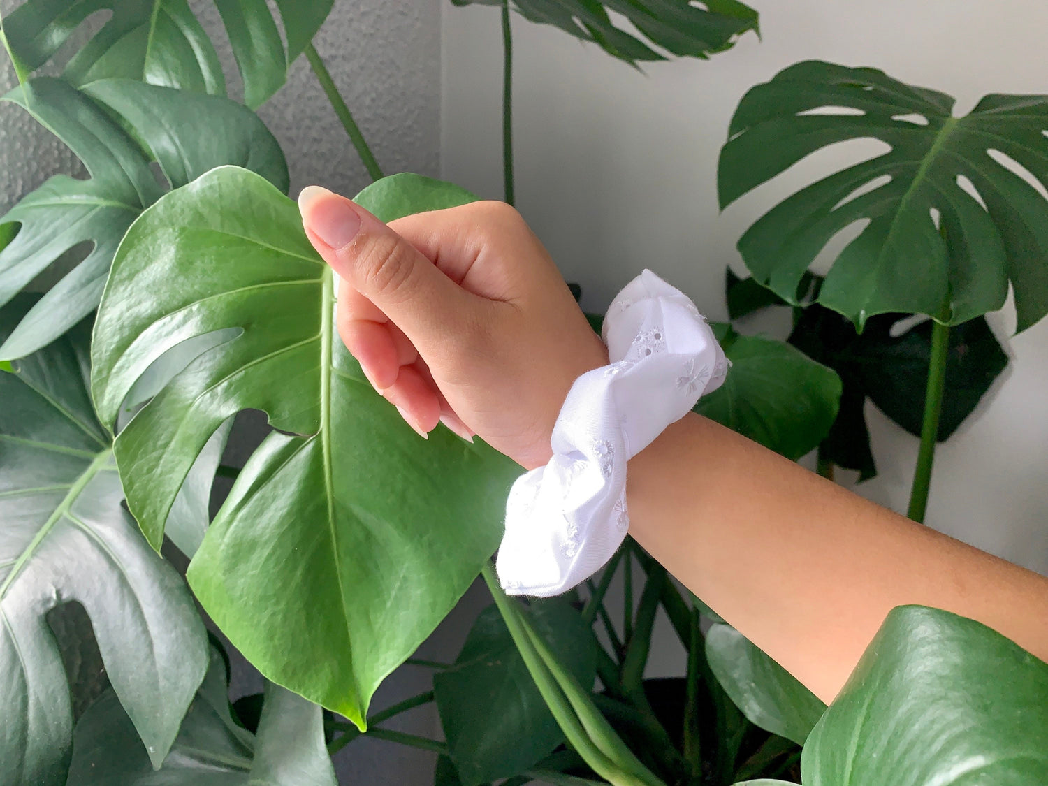 All of our scrunchies are delicately handmade. We carefully choose all of our fabrics with our customers in mind. This scrunchie was made using a beautiful white eyelet pattern cotton blend fabric.