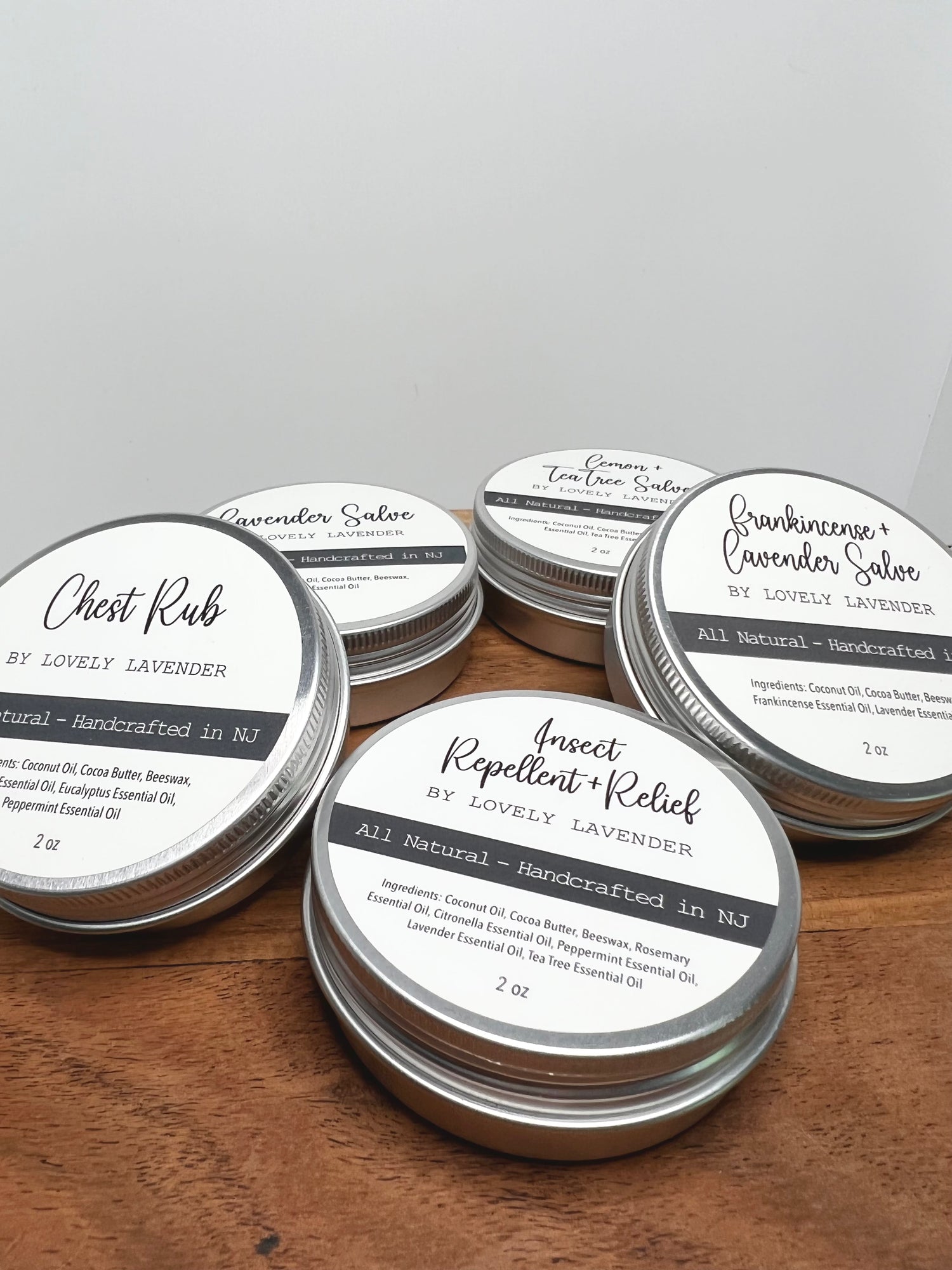 Our insect repellent and relief salve is made with rosemary, citronella, peppermint, lavender, and tea tree essential oils. Check out our “Insect Repellent and Relief” essential oil mist for a spray alternative! Here are the benefits of our ingredients: