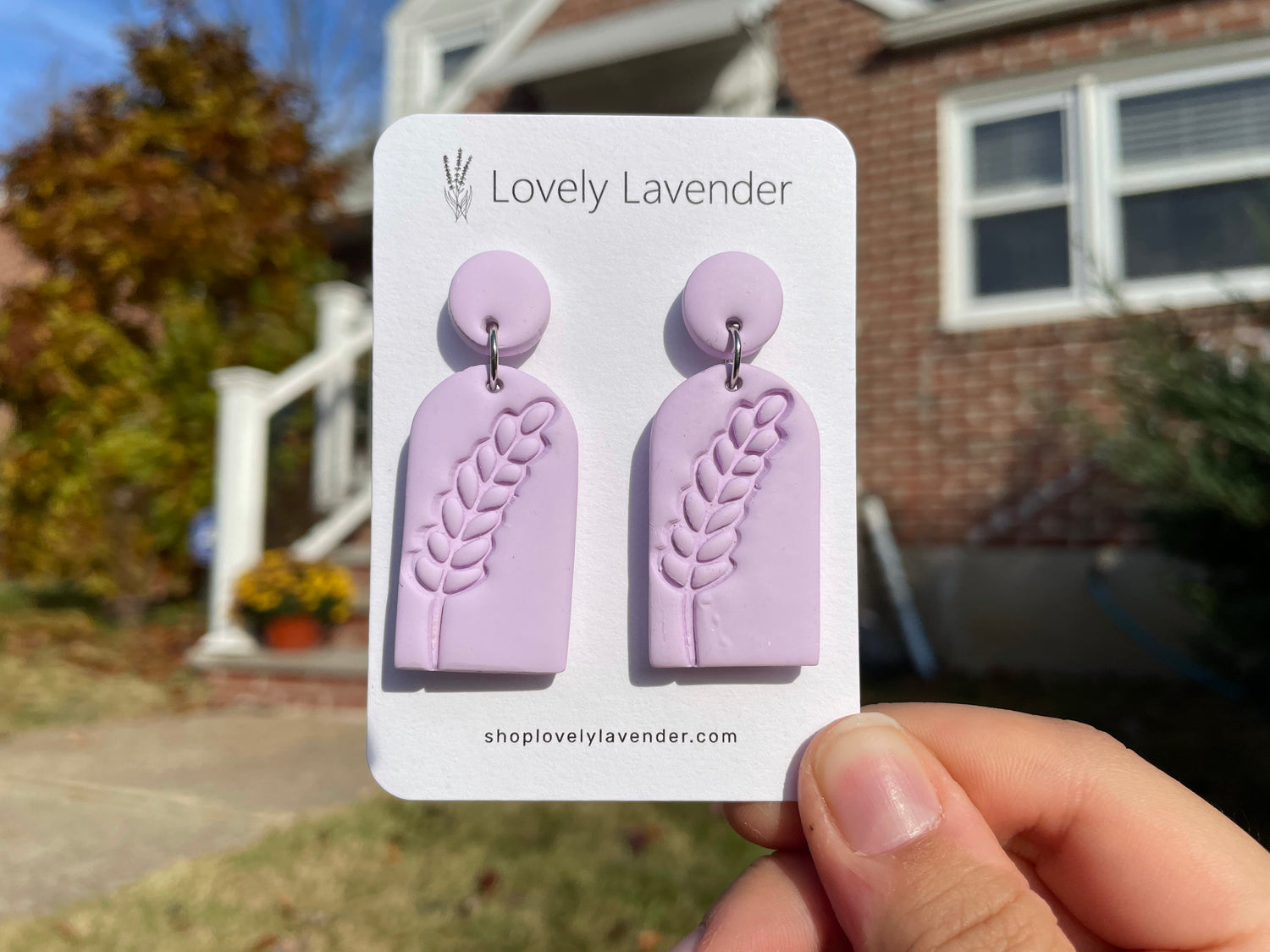 These are our signature Lovely Lavender earrings! These earrings are delicately handmade using polymer clay, mixed to create a lavender color, and embossed. The earring posts are baked into the clay stud to ensure the best quality for our customers.