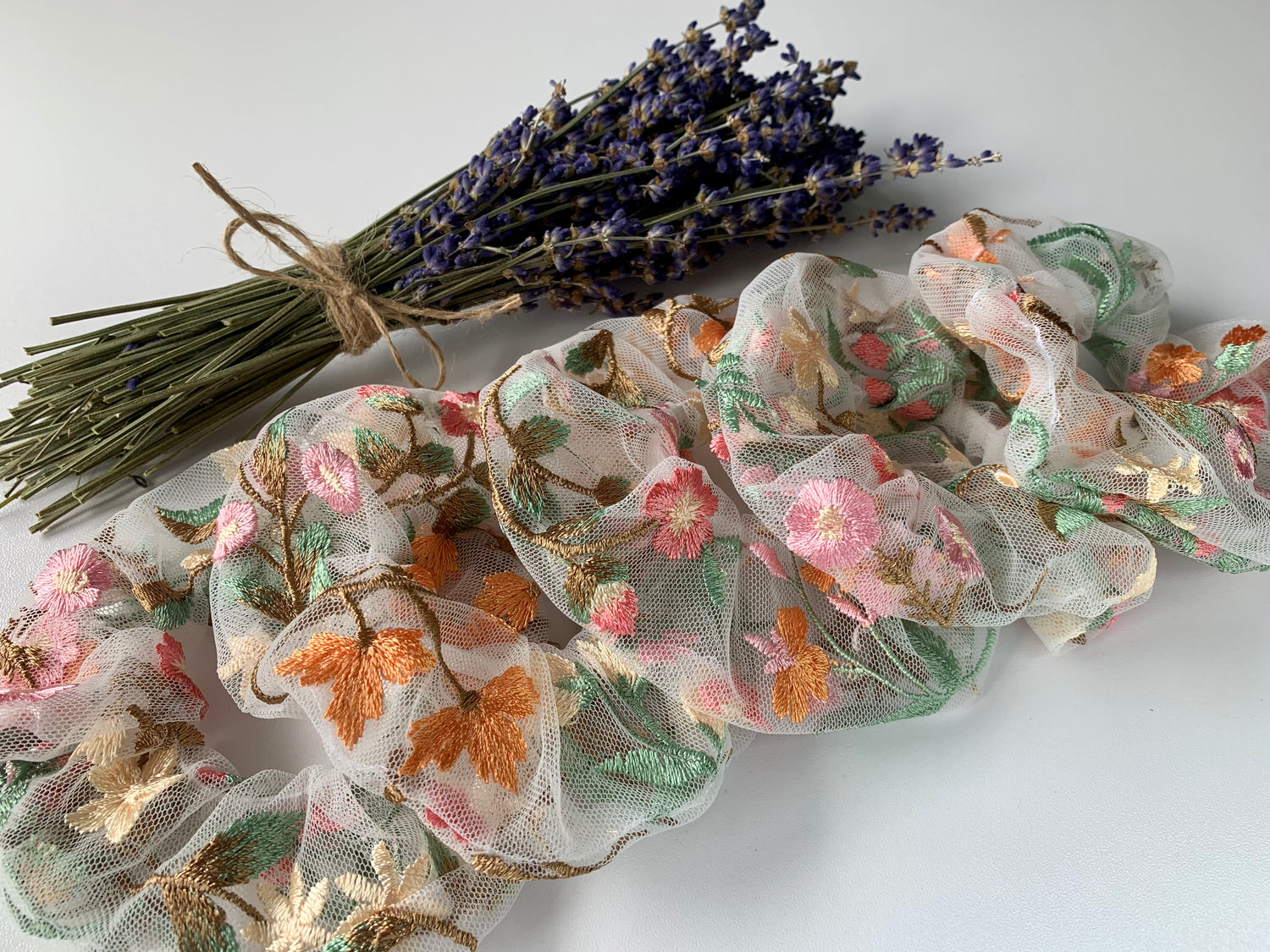 All of our scrunchies are delicately handmade. We carefully choose all of our fabrics with our customers in mind. This scrunchie was made using a soft, mesh fabric with beautiful floral embroidery!