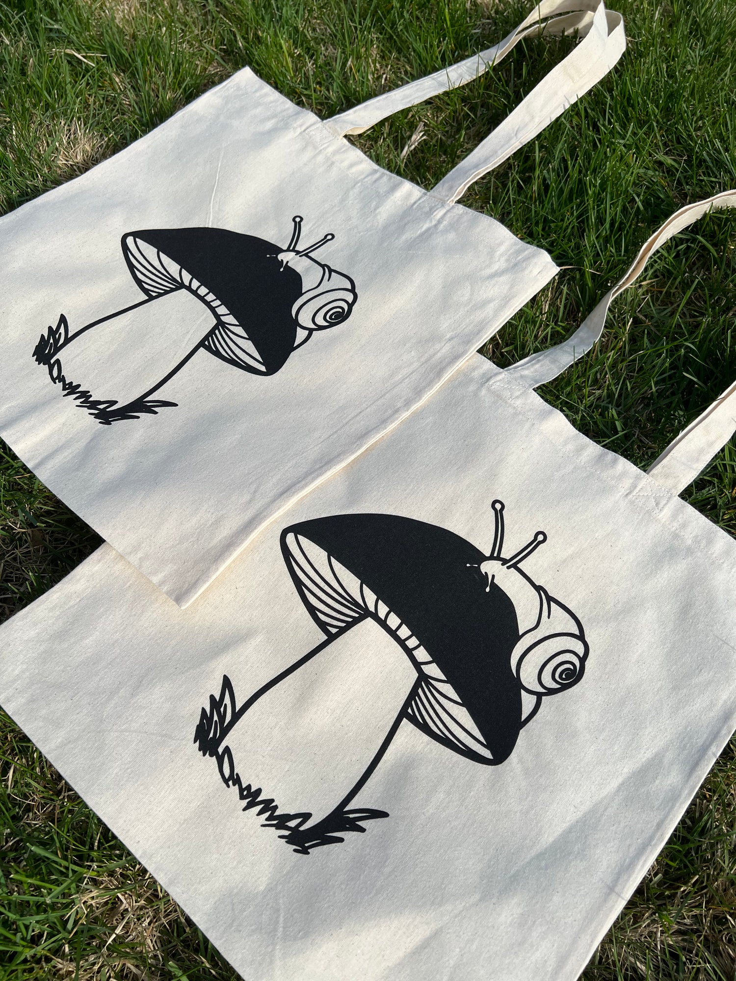 This bag is a great eco-friendly option! As with all of my designs, this mushroom snail design is drawn and screen printed at home.
